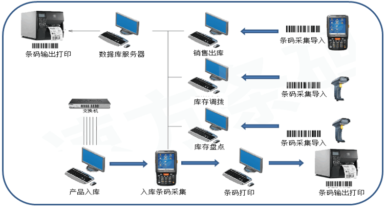 條碼倉庫管理系統(tǒng)應(yīng)用條碼數(shù)據(jù)采集系統(tǒng)來解決問題,在已經(jīng)安裝了計算機通信網(wǎng)絡(luò)的物流企業(yè),只需在數(shù)據(jù)錄入前增加一些條碼設(shè)備,具體的流程為: