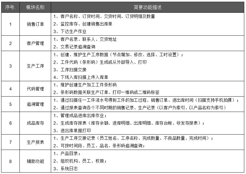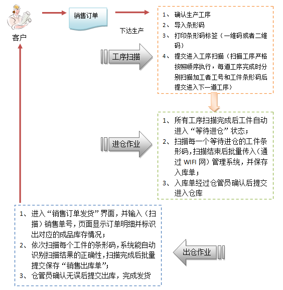 成品掃描入庫(產(chǎn)品完成最后一道工序后,通過采集器快速掃描入庫);成品出庫(根據(jù)訂單掃描出庫);