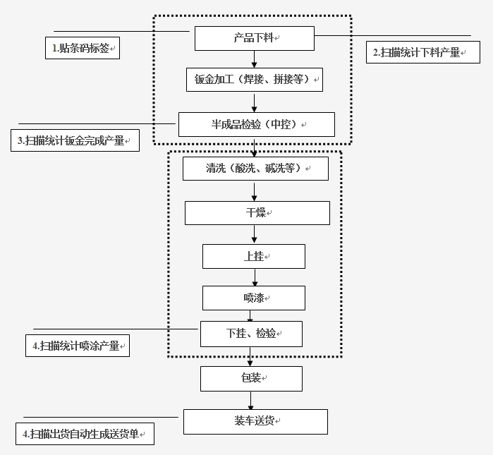 每道工序掃描后系統(tǒng)記錄:工件流水號(通過流水號可以關(guān)聯(lián)得到生產(chǎn)單、銷售單)、完成工序、完成時間、完成人。